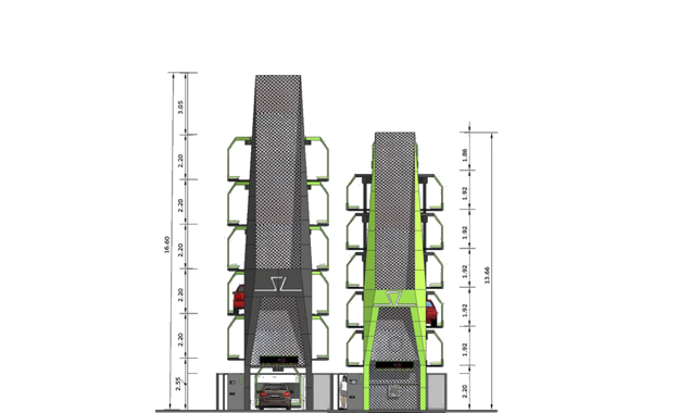 垂直循環(huán)類機(jī)械式停車設(shè)備是采用與地面垂直方向做循環(huán)運(yùn)動(dòng)而達(dá)到存取車輛的停車設(shè)備。其工作原理是通過(guò)減速電機(jī)帶動(dòng)傳動(dòng)機(jī)構(gòu),在牽引構(gòu)件-鏈條上,每隔一定距離安裝一個(gè)存車拖架,存車拖架隨鏈條一起作循環(huán)運(yùn)動(dòng),從而達(dá)到存取車輛的目的。